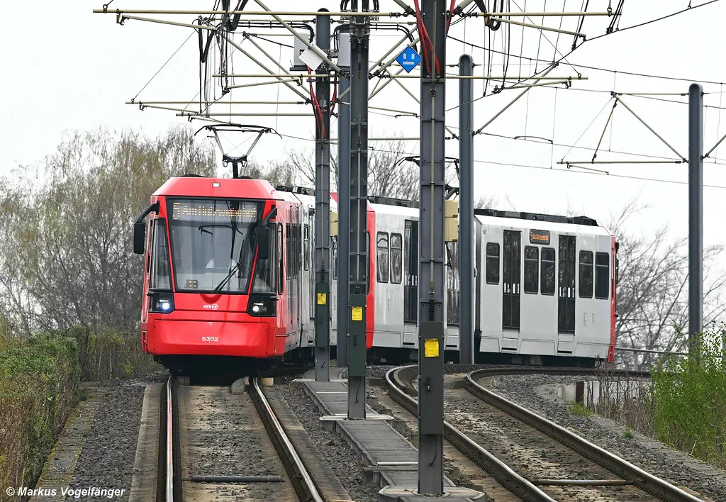 5321 und 5318 während des 2000-km-Tests auf der Kreuzung Aachener Str./Gürtel, auf der Aachener Straße in Junkersdorf, in Merheim und an der Haltestelle Kalker Friedhof am 11.04.2023.
