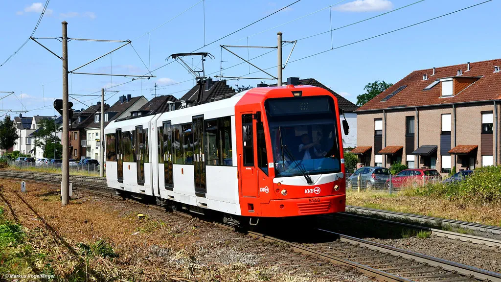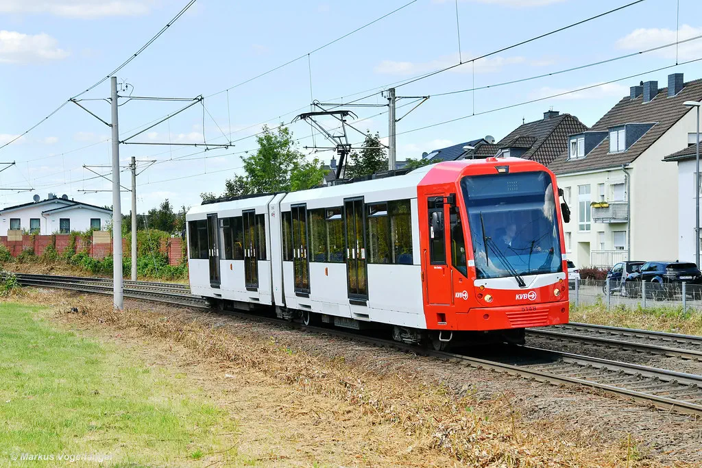 5148 wurde in die aktuellen KVB-Farben lackiert. Hier in Sürth am 28.06.2022.