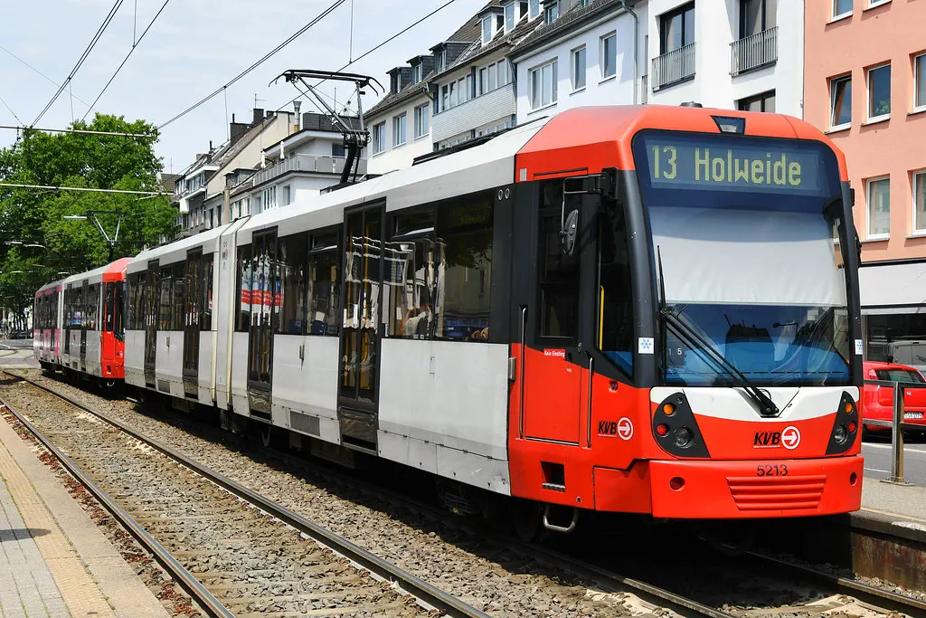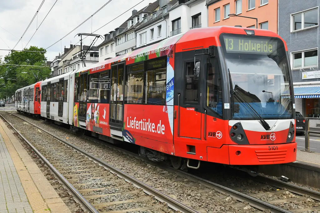 5126 wurde in die aktuellen KVB-Farben lackiert. Hier zu sehen auf dem Pfälzischen Ring am 16.07.2022.