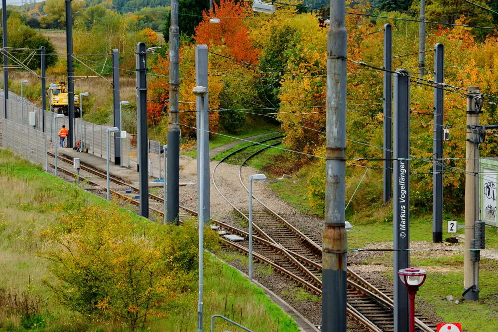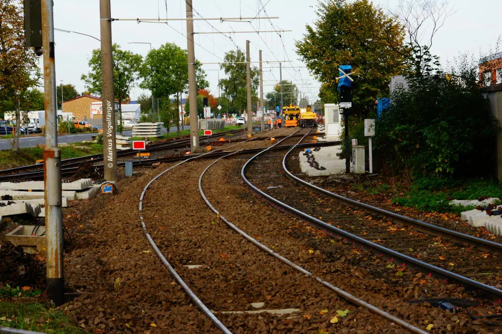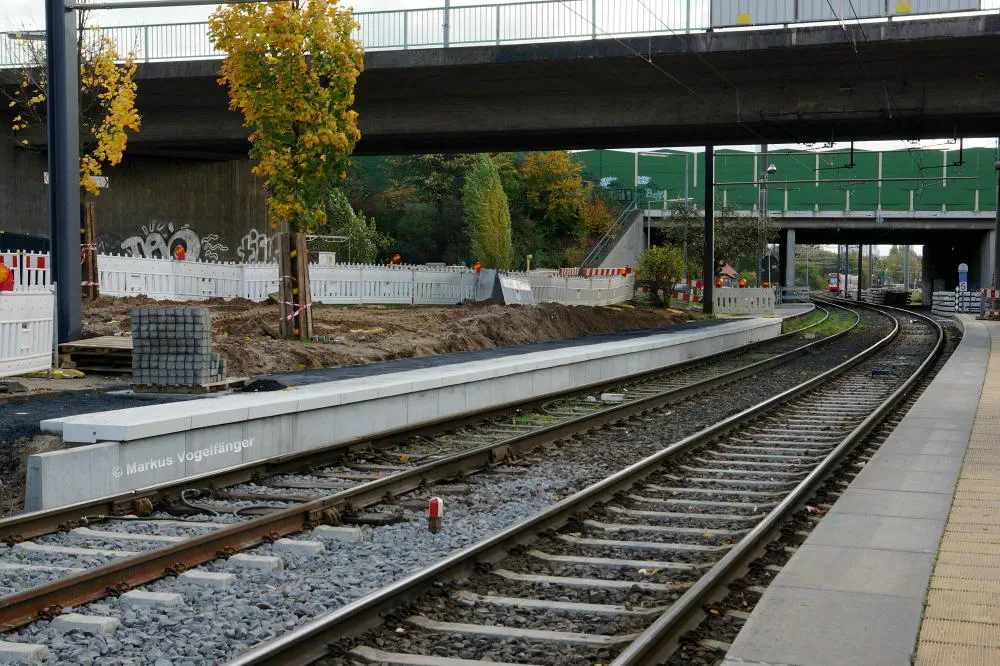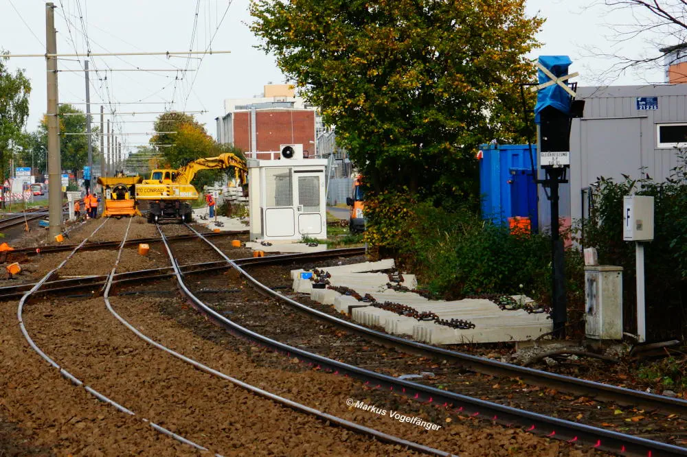 Die Haltestelle Fordwerke Mitte am 19.10.2013. Auf der rechten Seite wurde das Gleisbett bereits mit neuen Schwellen und gereinigtem Schotter versehen.