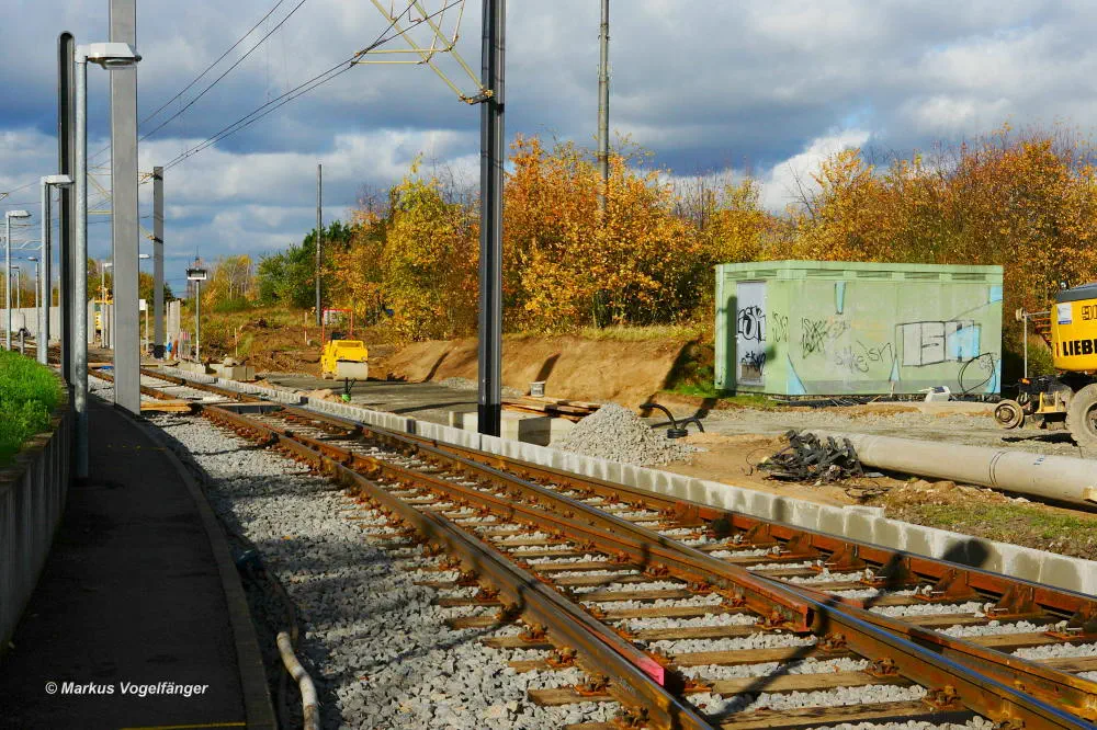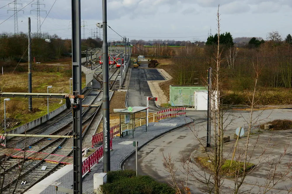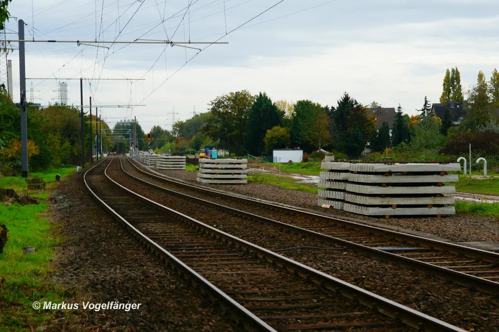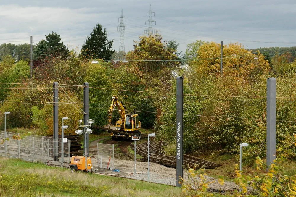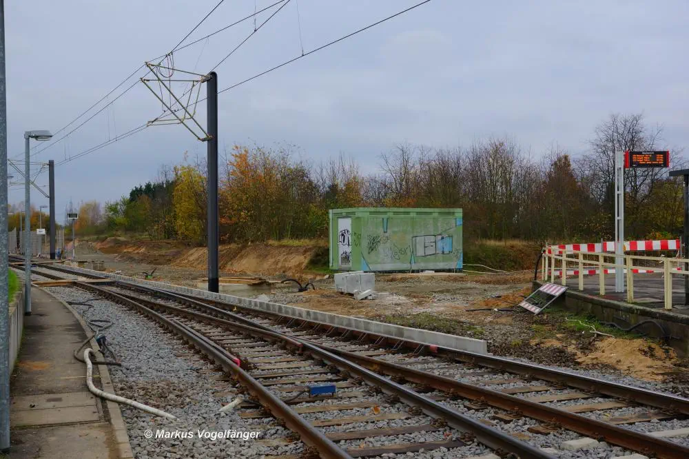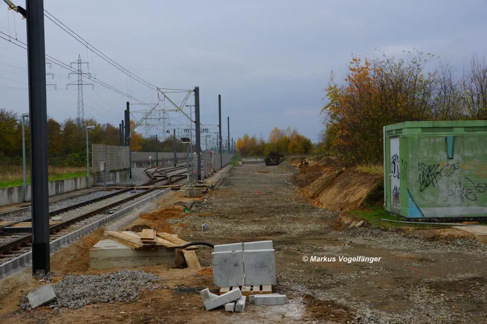 Der aktuelle Bauzustand des Streckenabschnittes zwischen den Haltestellen "Merkenich Mitte" und "Merkenich" am 09.11.2013.