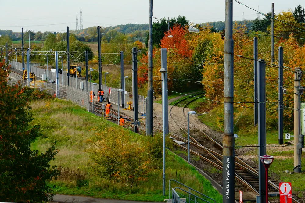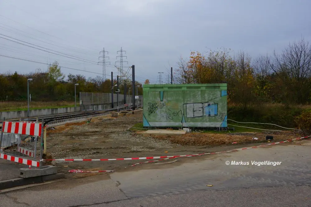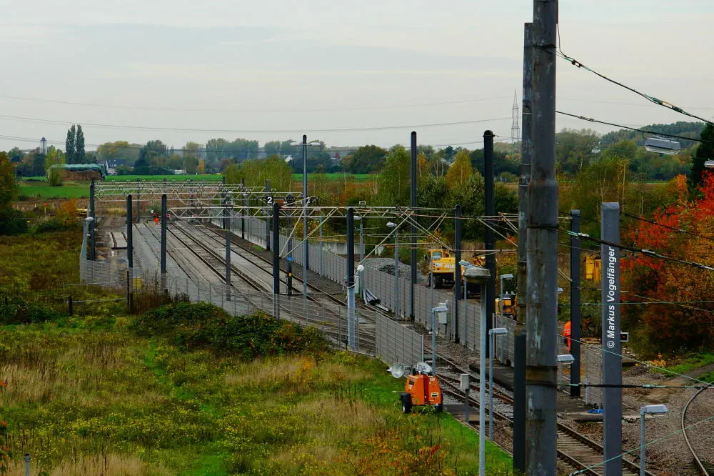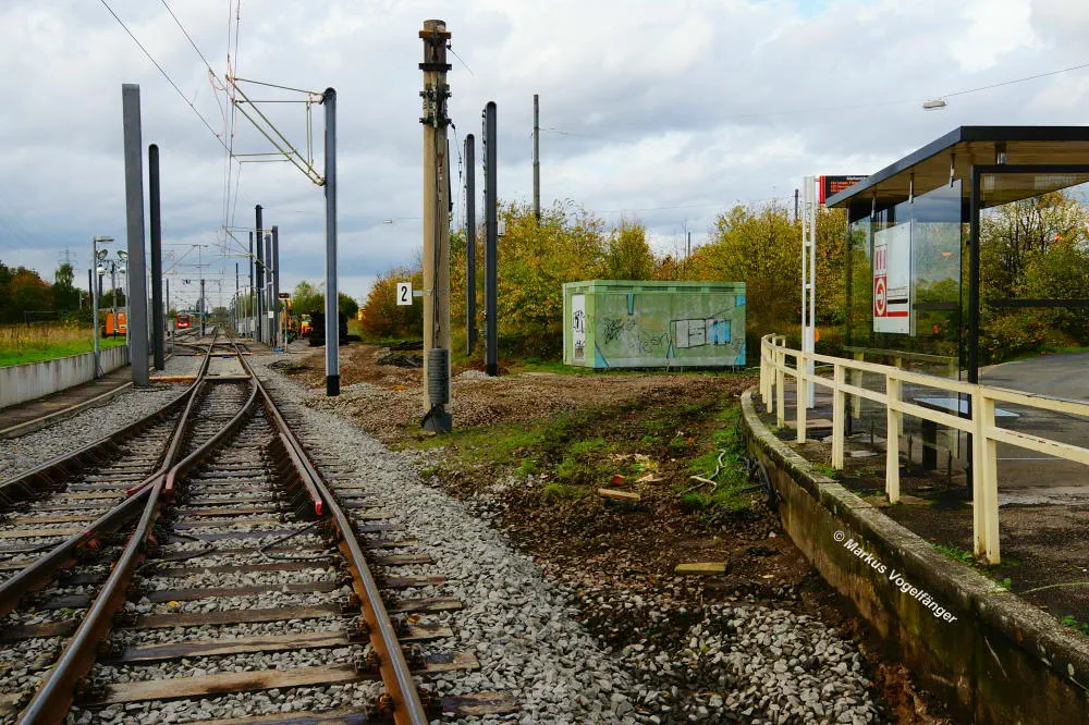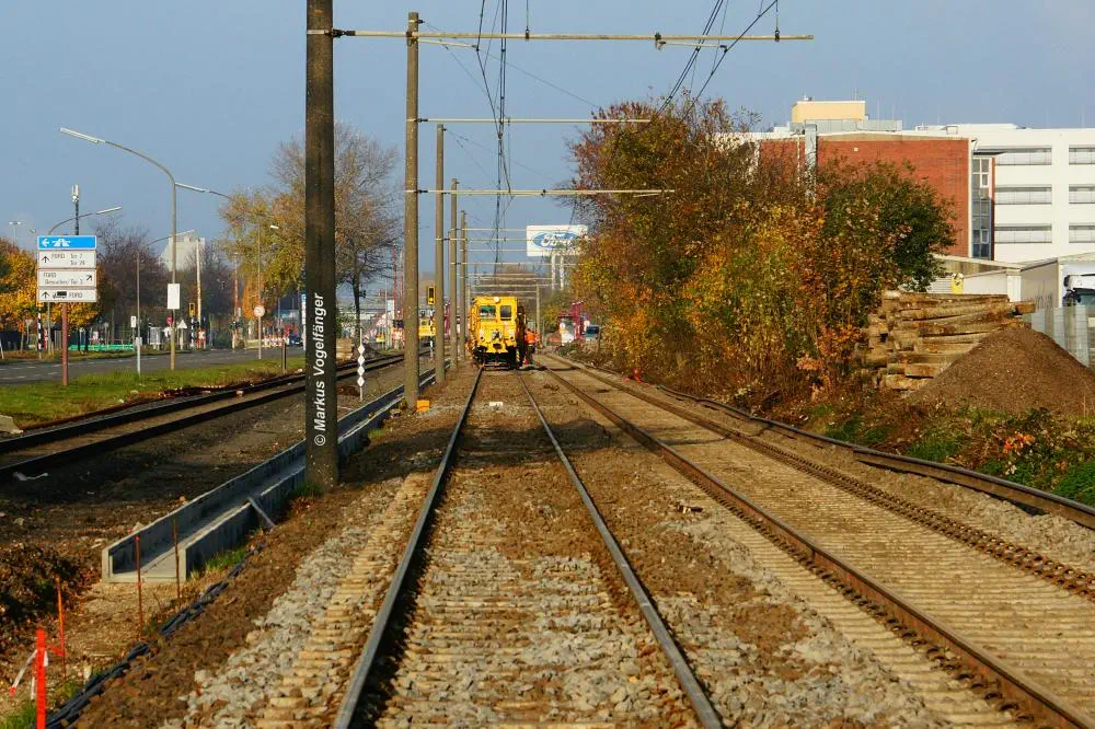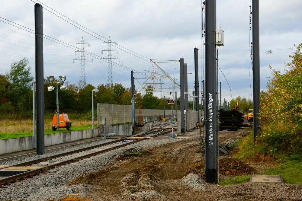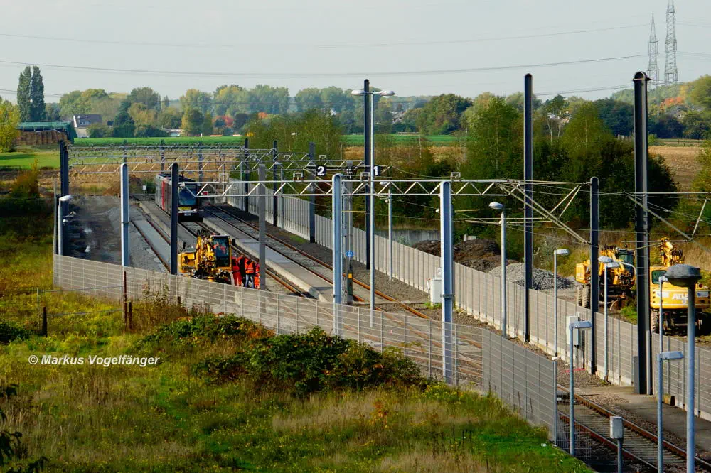 Der aktuelle Bauzustand des Streckenabschnittes zwischen den Haltestellen "Merkenich Mitte" und "Merkenich" am 09.11.2013.
