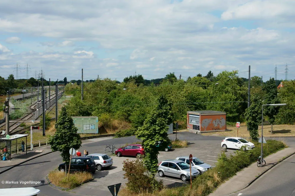 Blick von der Bremerhavener Straße auf die Emdener Straße. Links das Güterzuggleis und rechts die Streckengleise der Linie 12.