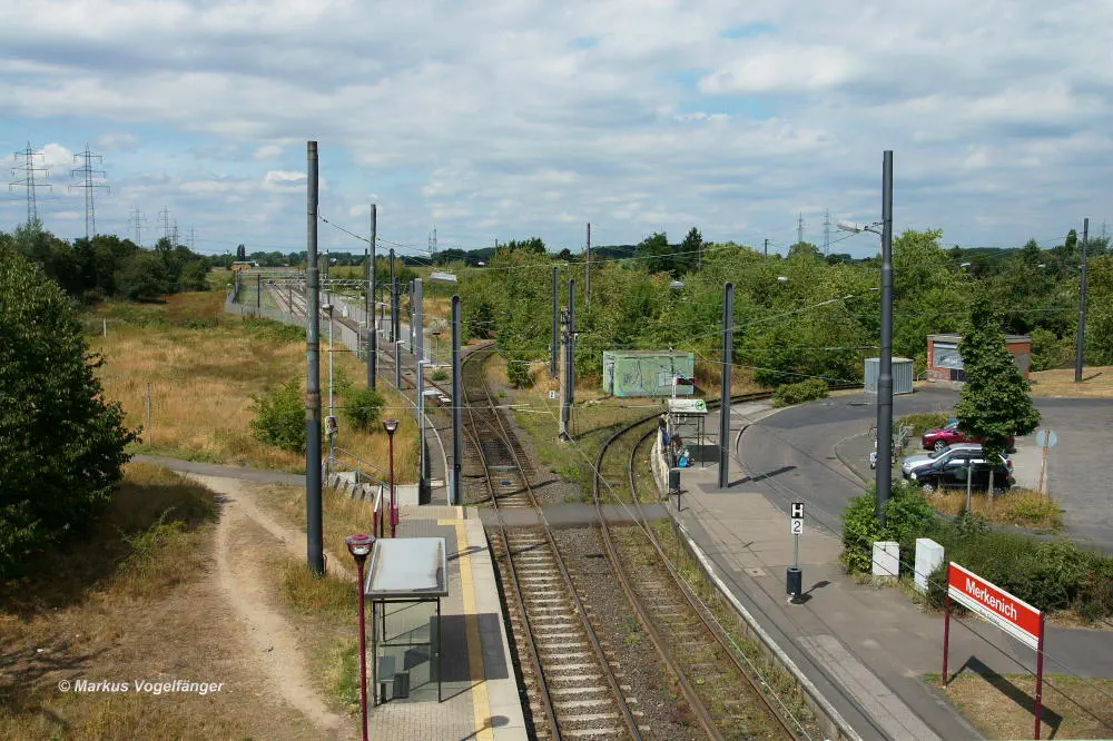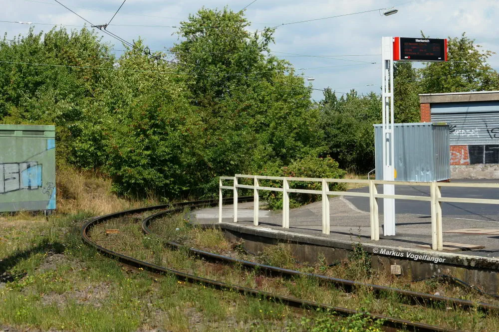 Die Ankunfts (hinten) und Abfahrtshaltestelle (vorne) Merkenich am 18.10.2013. Rechts ist der abgetragene Ankunftsbahnsteig zu sehen.