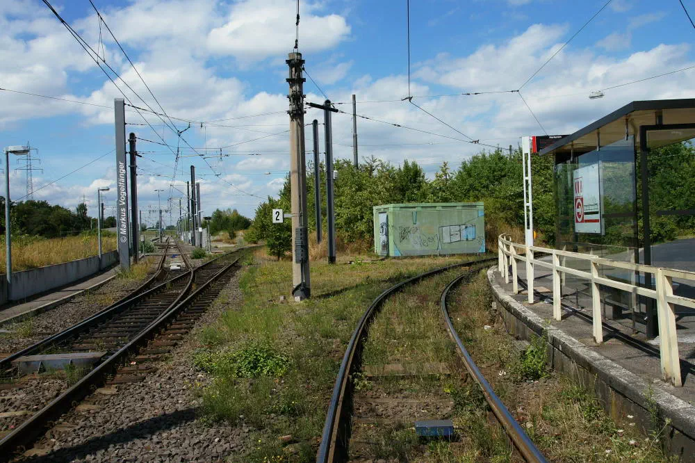 Die Streckengleise der Linie 12 zwischen den Haltestellen Merkenich und Merkenich Mitte.