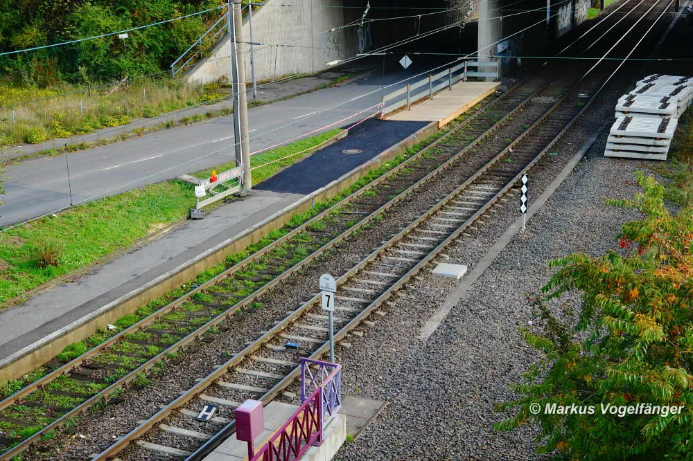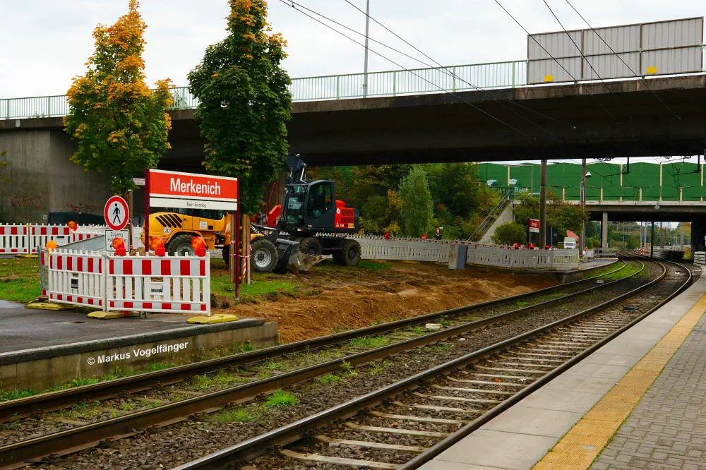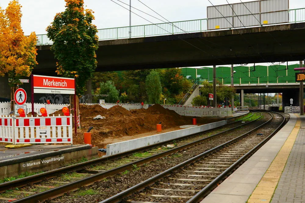 Die Ankunftsbahnsteig Merkenich (im Hintergrund) am 18.10.2013. Er wurde provisorisch um einige Meter Richtung Merkenich Mitte verlegt.
