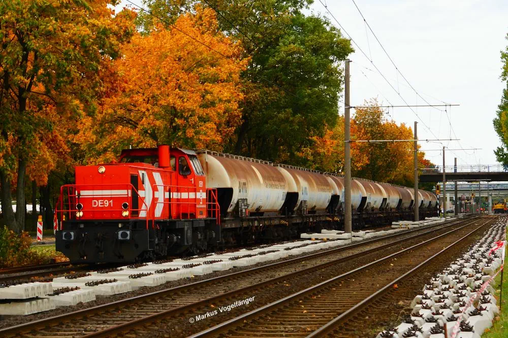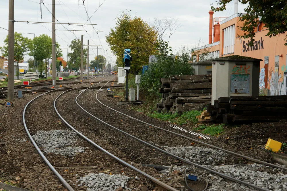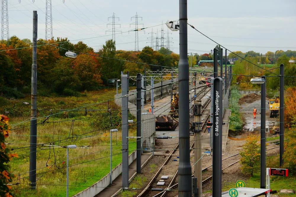 Blick von der Bremerhavener Straße auf die Emdener Straße. Auf dem linken Streckengleis wurde bereits das Gleisbett erneuert wobei der Schotter gereinigt wurde und neue Schwellen verlegt worden sind. Rechts ist das alte Gleisbett mit pinken Markierungen an den Gleisen für die neue Position der neuen Schwellen zu sehen. Nach der Fertigstellung des neuen Gleisbettes werden dann die Schienen und die Gleiskreuzungen erneuert.