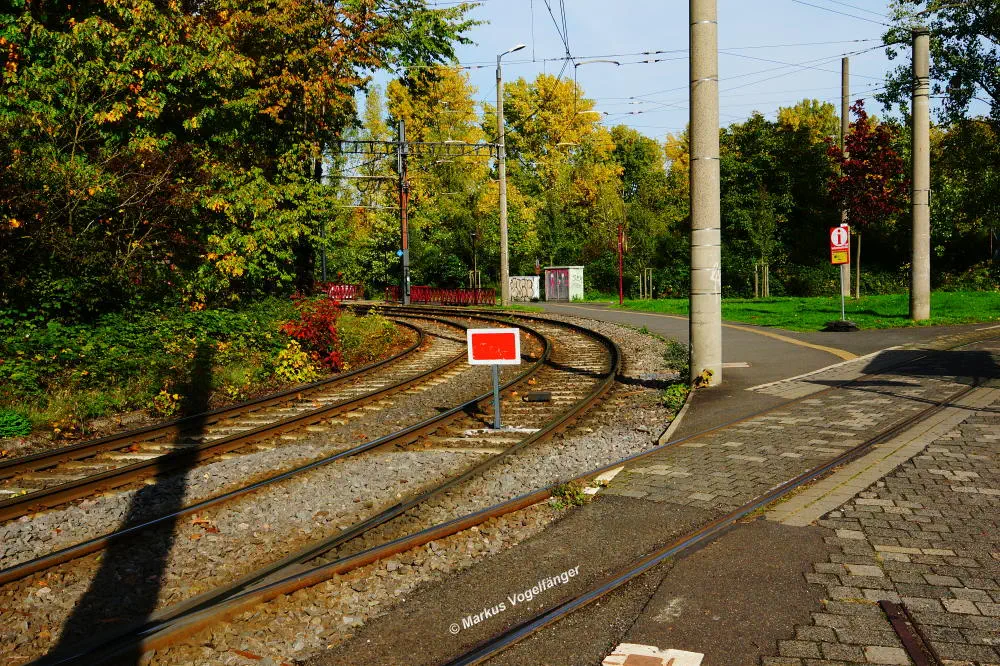 Die Streckengleise der Linie 12 mit zwei zu erneuernden Gleiskreuzungen zwischen den Haltestellen Fordwerke Mitte und Fordwerke Süd (Blickrichtung Fordwerke Süd) am 19.10.2013.