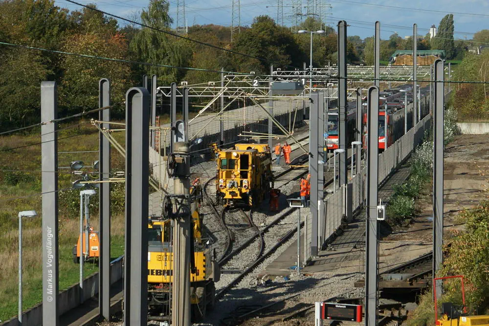 Blick von der Bremerhavener Straße auf die Emdener Straße am 20.10.2013. Das Gleisbett wurde für beide Streckengleise gereinigt und die Schwellen wurden ausgetauscht.