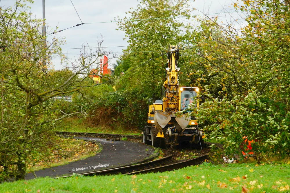 Ein Bagger transportiert die nicht mehr benötigten alten Gleise der ehemaligen Wendeschleife "Merkenich" ab.