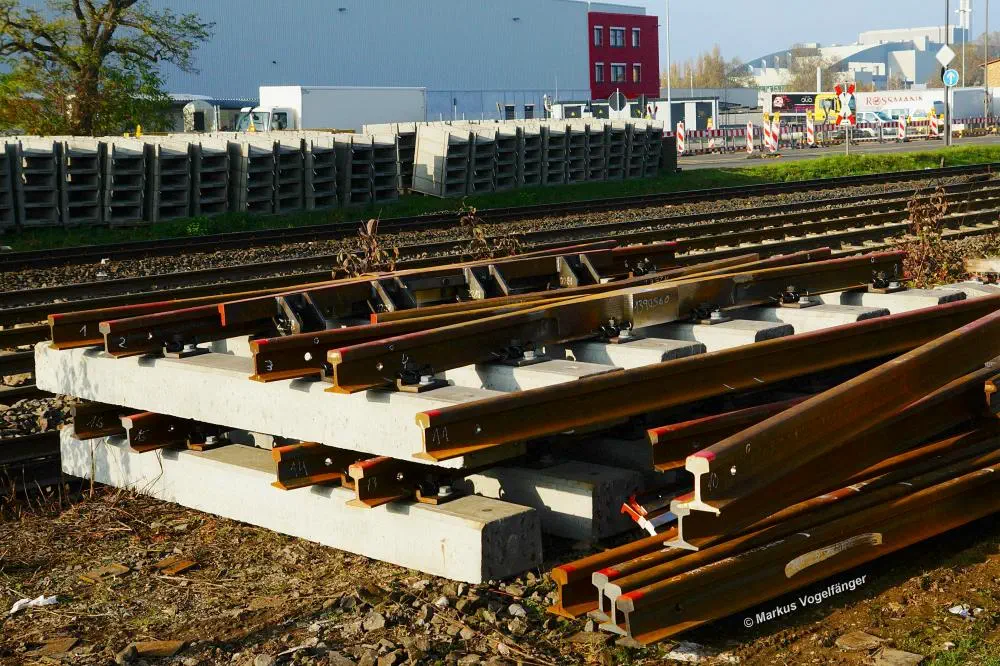 Die neuen Betonschwellen mit Gleisbefestigung am 19.10.2013.