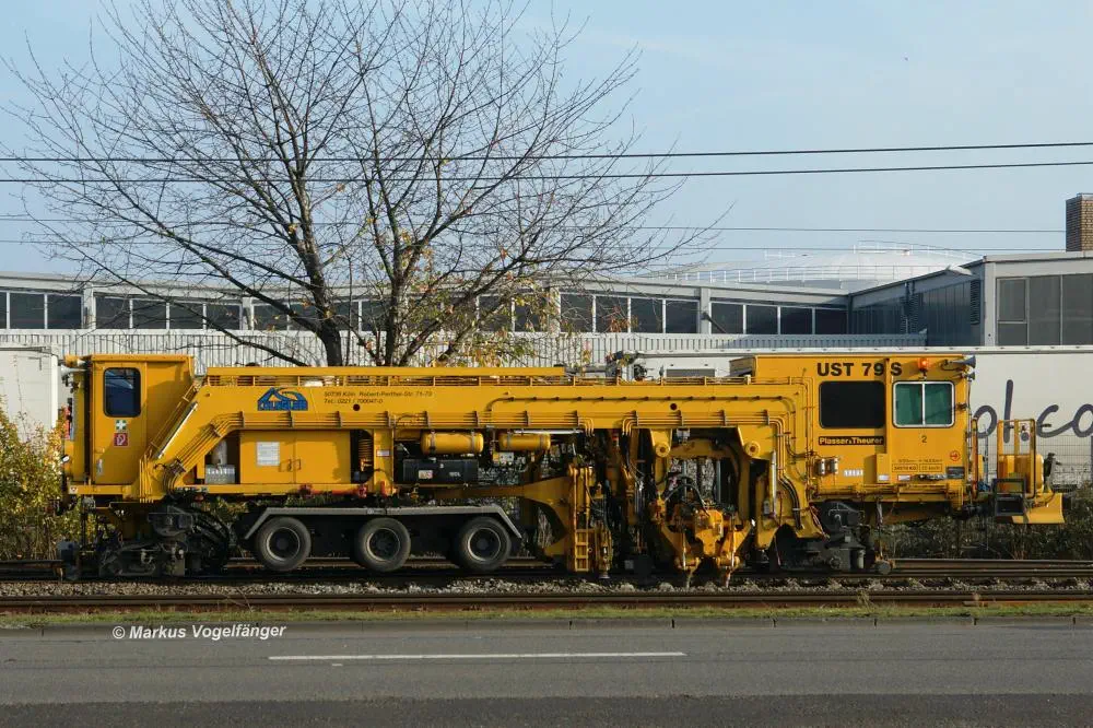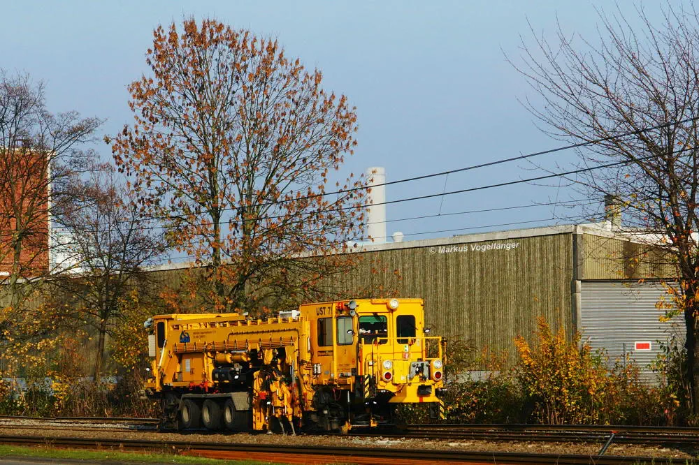 Die Stopfmaschine auf Gleis 1 (ehemaliges Gleis 2, Mitte) in der Wende und Abstellanlage Merkenich am 27.10.2013. Die neue Weiche für Gleis 1 (ehemaliges Gleis 2, Mitte) und Gleis 2 (neues Gleis ganz links) wurde angeschlossen und die alte Weiche zwischen dem alten Gleis 1 (neues Regelwendegleis, rechts und Gleis 1 (altes Gleis 2, Mitte) wurde ausgebaut.