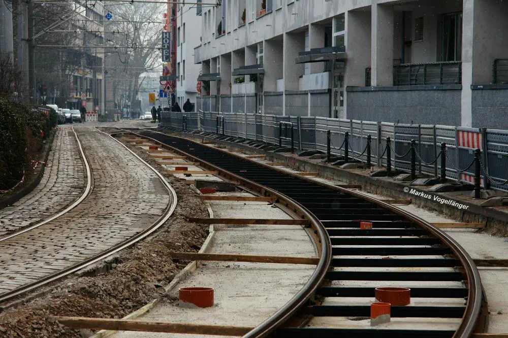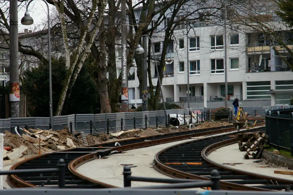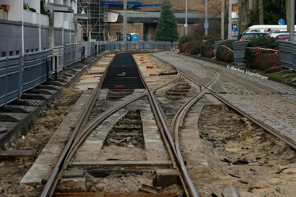 Nachdem die Gleise an der Mauritiuskirche neu verlegt worden sind und der Stadtbahnbetrieb wieder aufgenommen wurde, wird das Natursteinplaster aus Blaubasalt welches im Rahmen der Bauarbeiten entfernt wurde, nun bis Ende Mai 2013 wieder eingebaut.