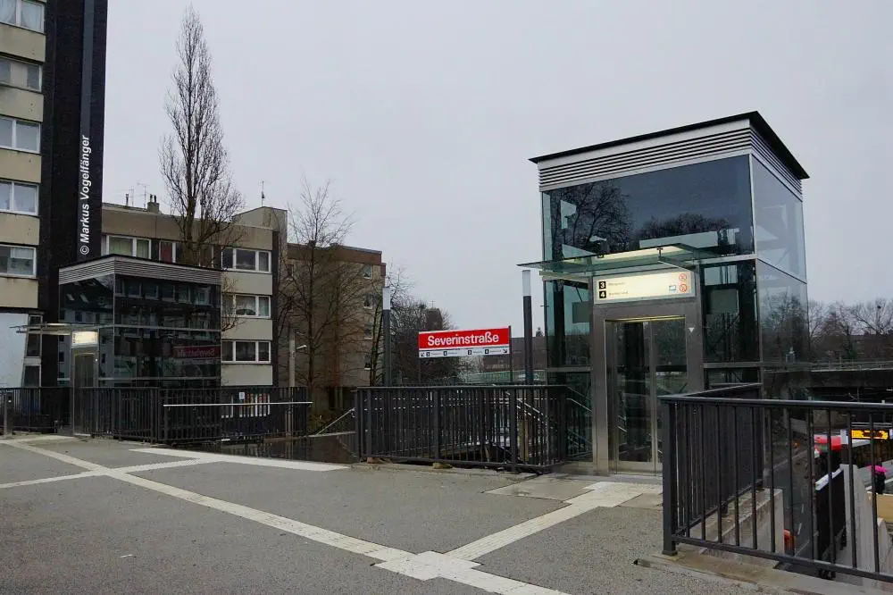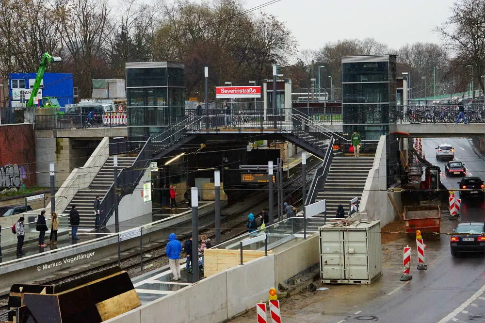 Der Aufzug zum Bahnsteig der neuen oberirdischen Haltestelle Severinstraße der Linien 3 und 4 Fahrtrichtung Suevenstraße