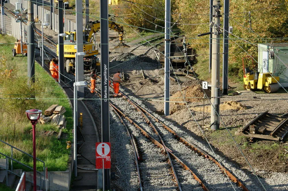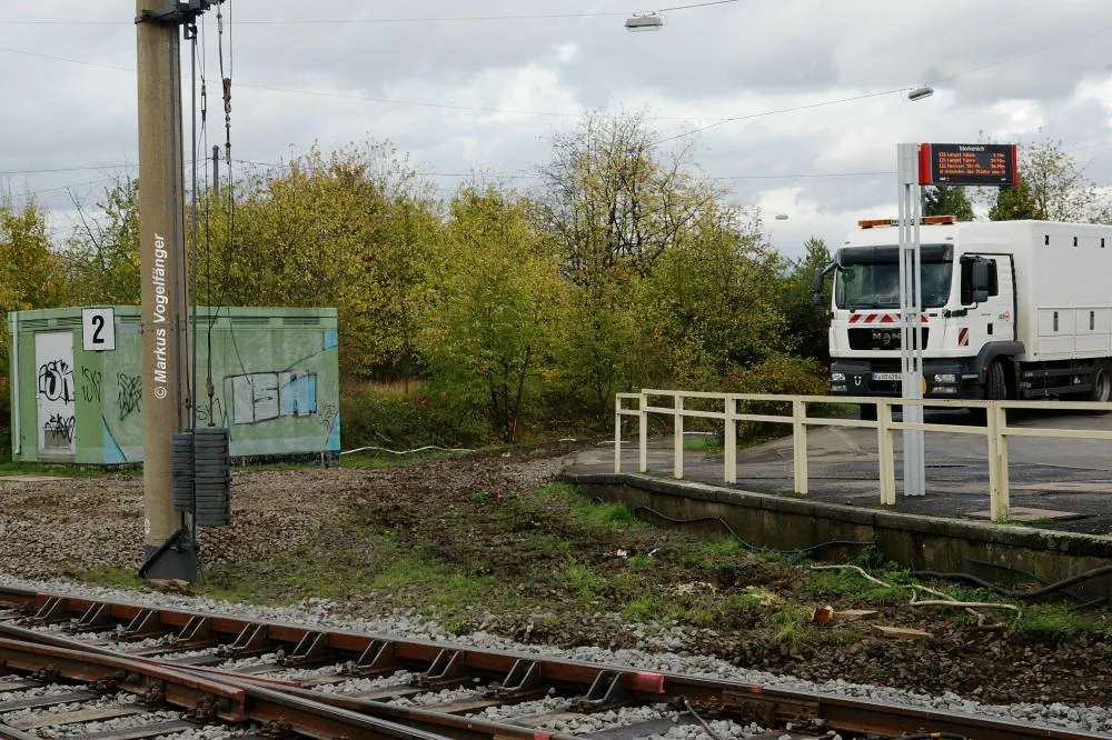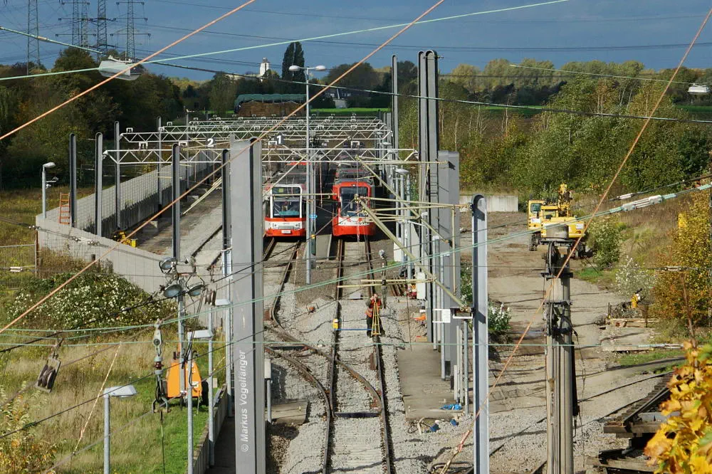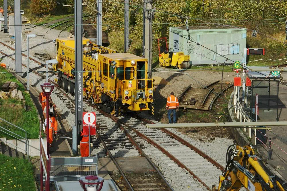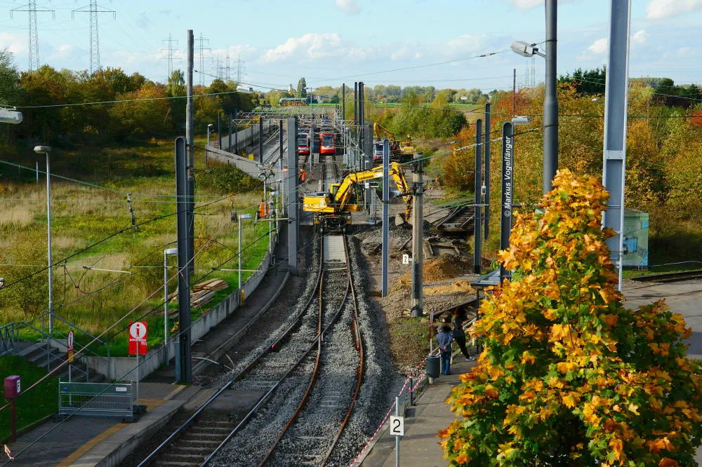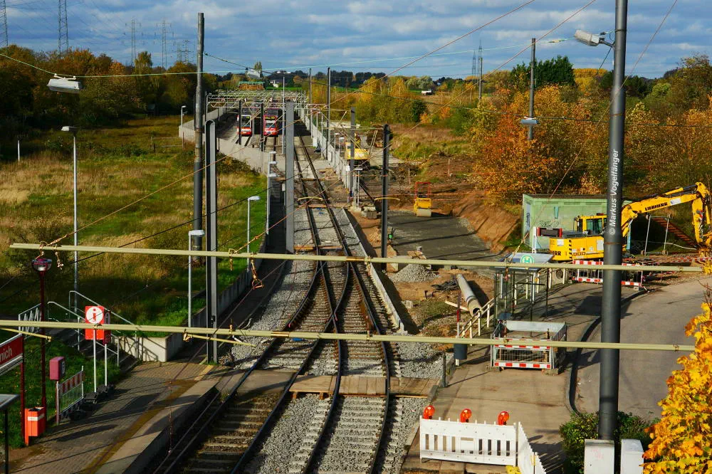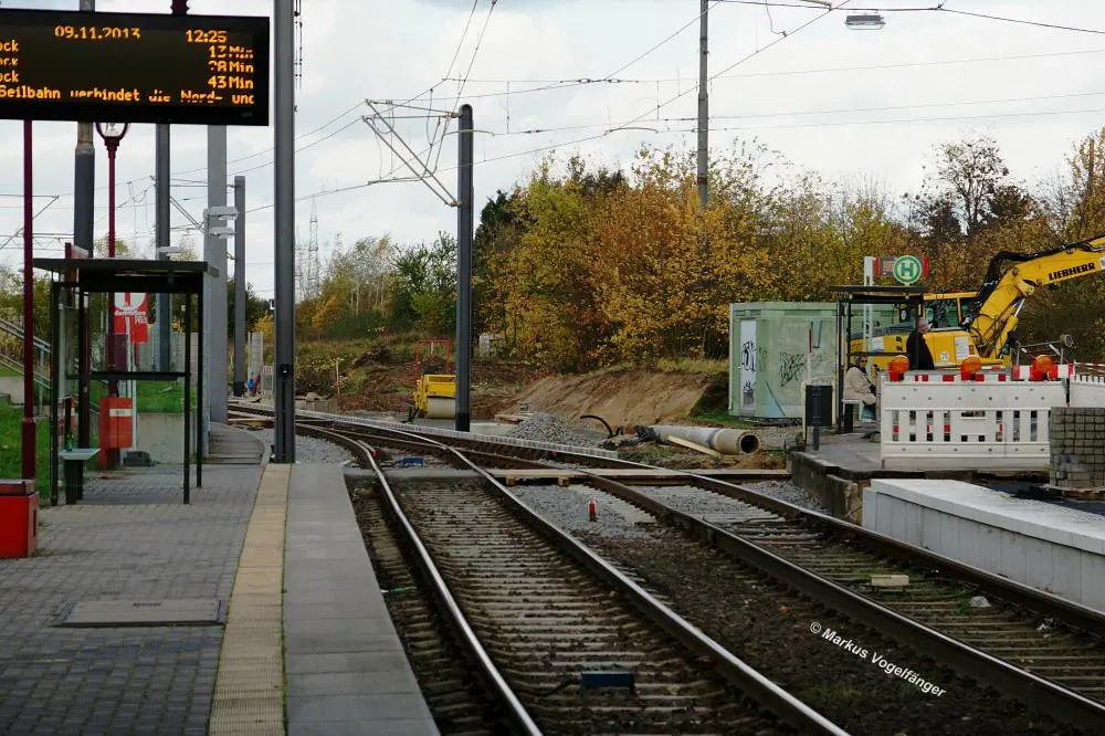 Die Haltestelle Fordwerke Mitte am 19.10.2013. Auf der rechten Seite wurde das Gleisbett bereits mit neuen Schwellen und gereinigtem Schotter versehen.