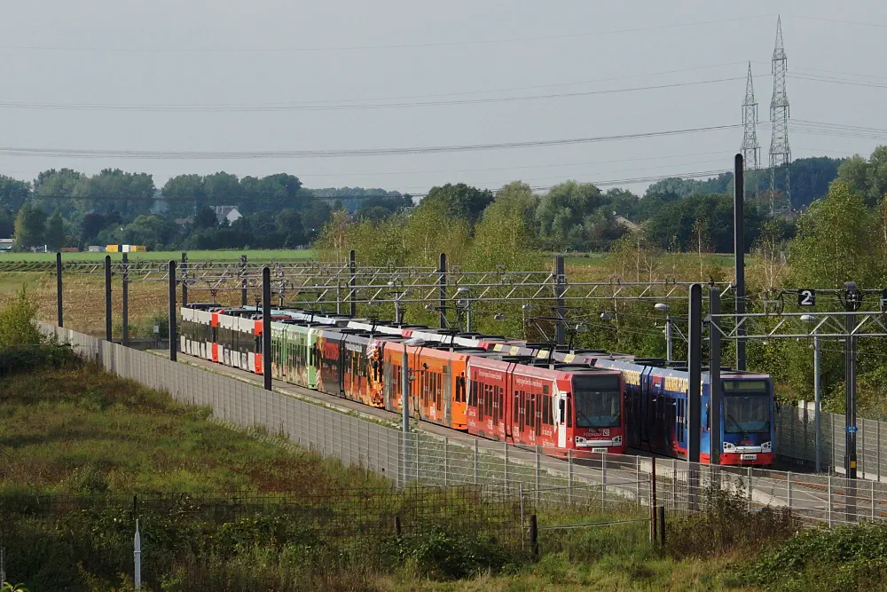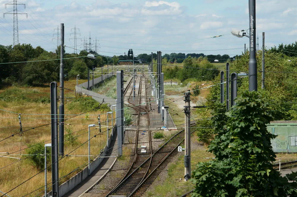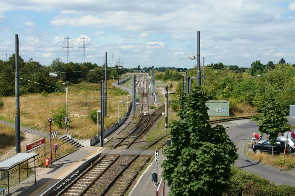 Die Streckengleise der Linie 12 zwischen den Haltestellen Merkenich und Merkenich Mitte.