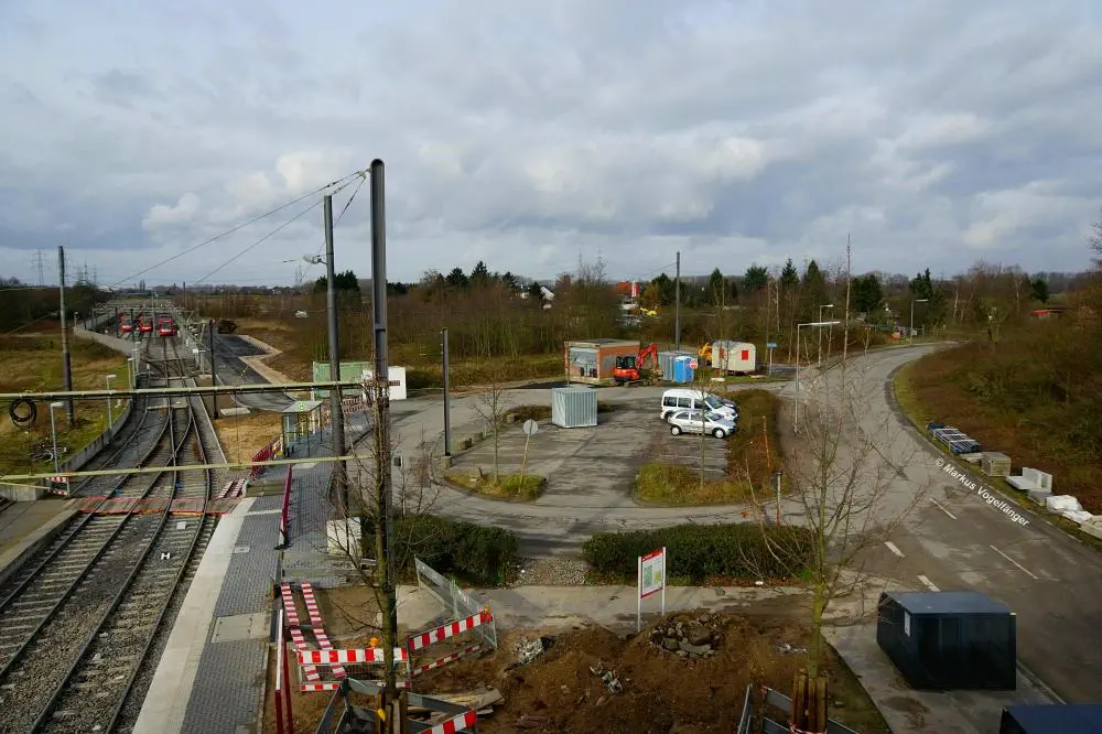 Die Ankunftsbahnsteig Merkenich (im Hintergrund) am 18.10.2013. Er wurde provisorisch um einige Meter Richtung Merkenich Mitte verlegt.