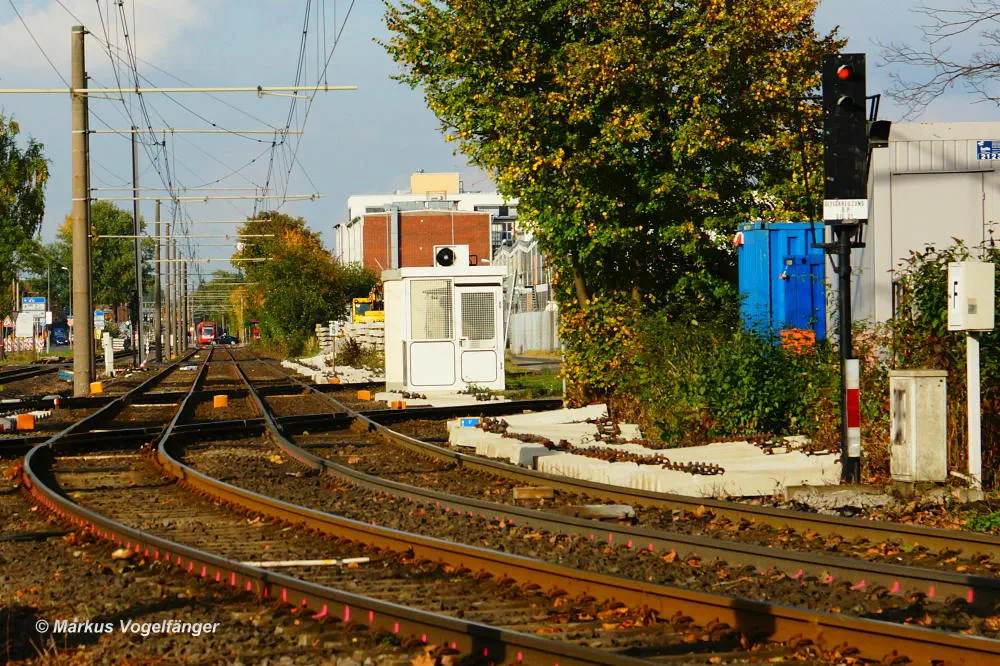 Die Streckengleise der Linie 12 mit zwei zu erneuernden Gleiskreuzungen zwischen den Haltestellen Fordwerke Mitte und Fordwerke Süd (Blickrichtung Fordwerke Süd) am 19.10.2013.
