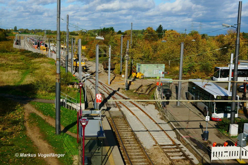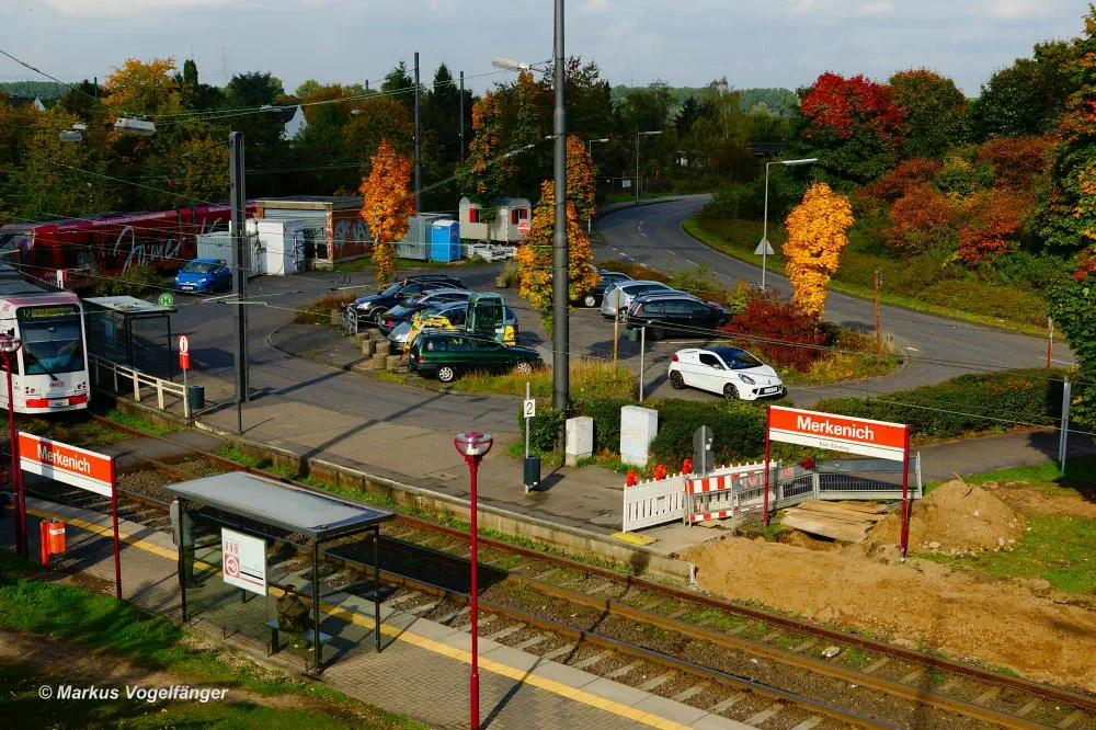 Die Ankunfts (hinten) und Abfahrtshaltestelle (vorne) Merkenich am 18.10.2013. Rechts ist der abgetragene Ankunftsbahnsteig zu sehen.