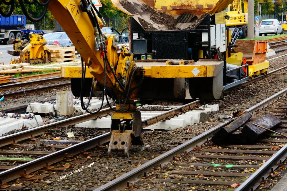 Ein Bagger transportiert die nicht mehr benötigten alten Gleise der ehemaligen Wendeschleife "Merkenich" ab.