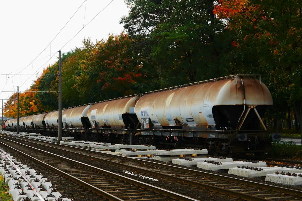 Ein Güterzug auf der Emdener Straße zwischen den Haltestellen Fordwerke Mitte und Fordwerke Nord am 19.10.2013. Im Vordergrund sind die zu erneuernden Streckengleise der Linie 12 zu sehen.