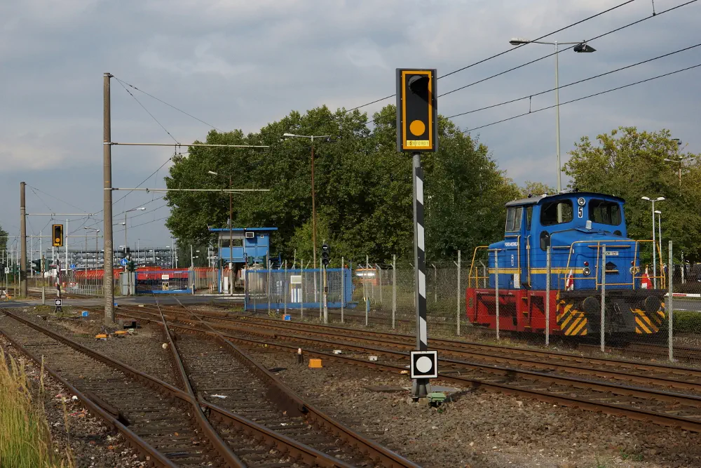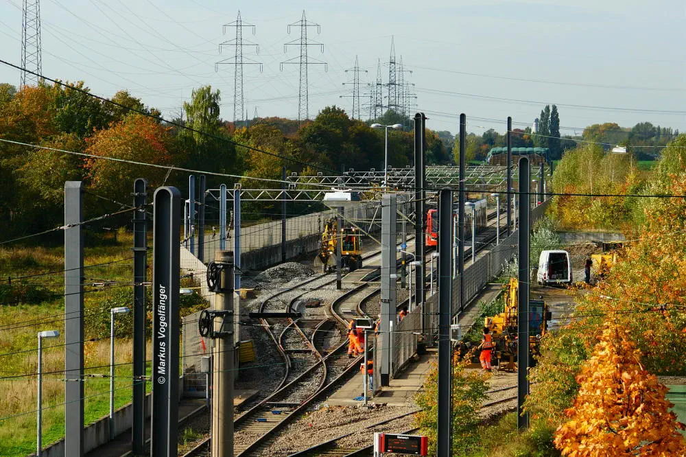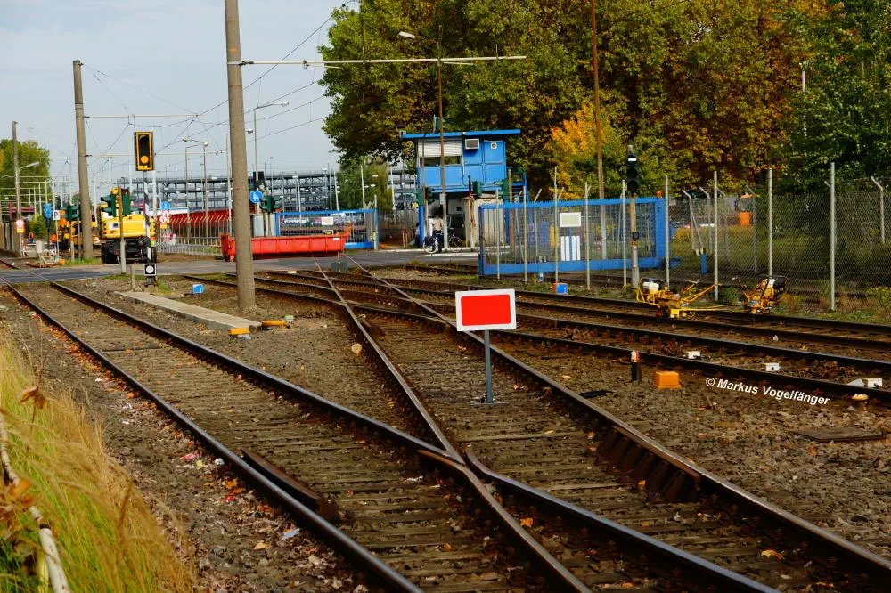 Blick von der Bremerhavener Straße auf die Emdener Straße. Auf dem linken Streckengleis wurde bereits das Gleisbett erneuert wobei der Schotter gereinigt wurde und neue Schwellen verlegt worden sind. Rechts ist das alte Gleisbett mit pinken Markierungen an den Gleisen für die neue Position der neuen Schwellen zu sehen. Nach der Fertigstellung des neuen Gleisbettes werden dann die Schienen und die Gleiskreuzungen erneuert.