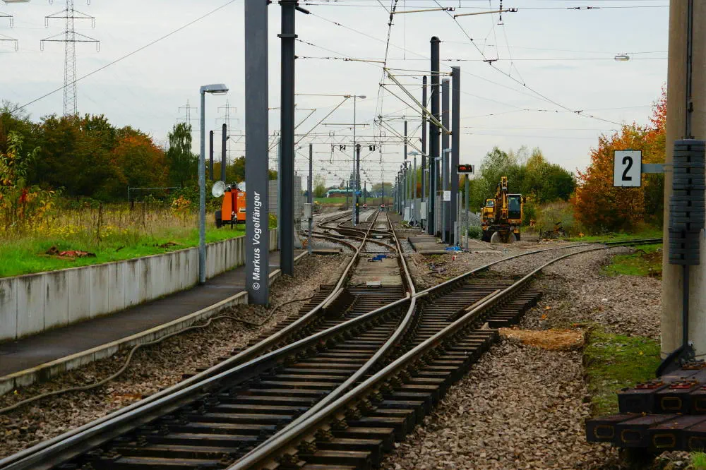 Blick von der Bremerhavener Straße auf die Emdener Straße am 20.10.2013. Das Gleisbett wurde für beide Streckengleise gereinigt und die Schwellen wurden ausgetauscht.