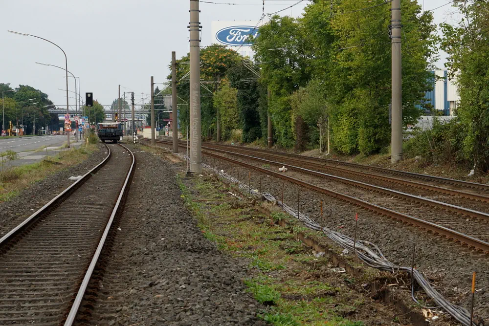 die zu erneuernde Gleisanlage der Linie 12 (rechts) zwischen den Haltestellen Geestemünder Straße und Fordwerke Süd (Blickrichtung Merkenich) am 21.09.2013. Links ist das Güterzuggleis zu sehen.