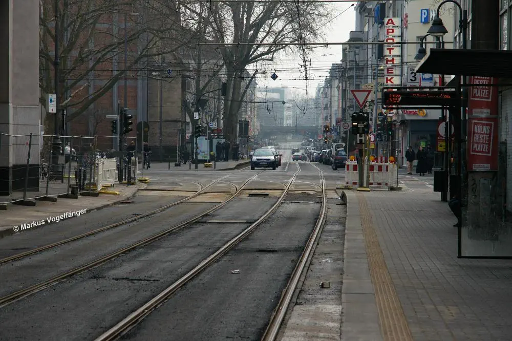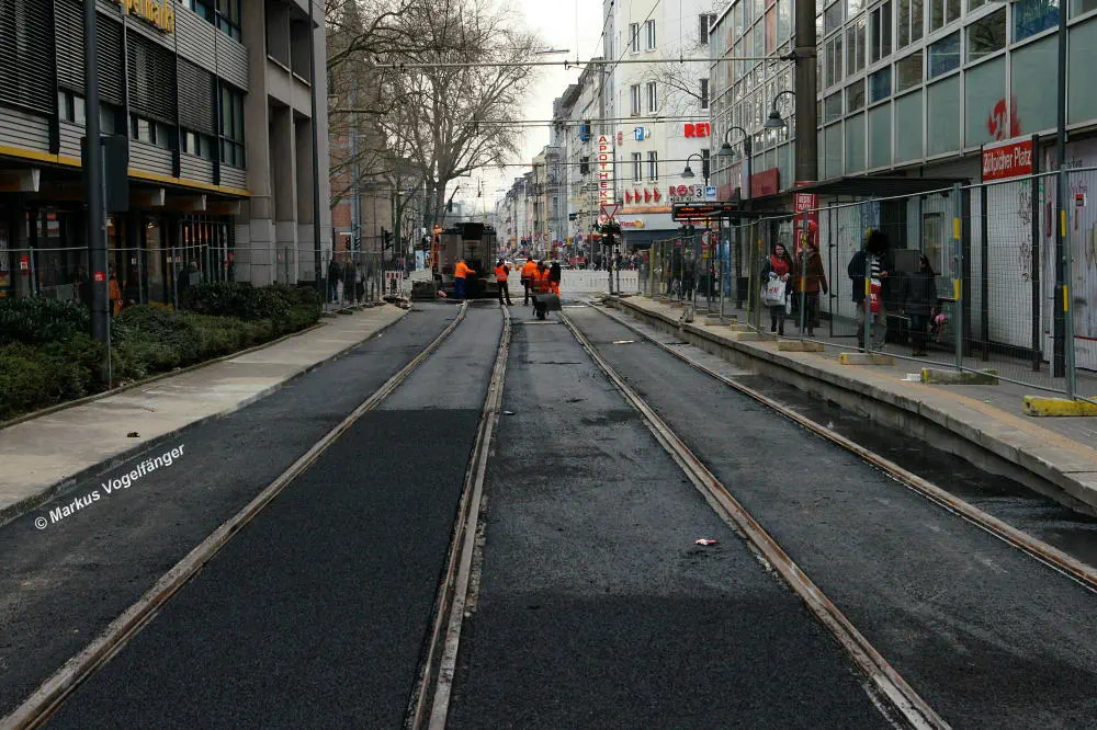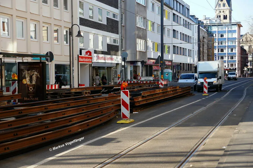 Zwischen den Haltestellen Zülpicher Platz und Mauritiuskirche werden seit diesem Wochenende (23.03.2013) die Gleise getauscht. Aus diesem Grund wird die Linie 9 bis zum 29.03.2013, sowie vom 02.04.2013 bis zum frühen Morgen des 08.04.2013 getrennt. Dabei wird die Strecke Sülz, Hermeskeiler Platz bis zur Universität, sowie der Abschnitt Königsforst bis zur Moltkestraße mit Stadtbahnen bedient. Den fehlenden Abschnitt übernehmen Ersatzbusse.